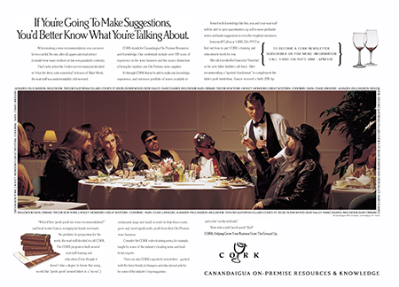 This is an award-winning print campaign for CORK (Canandaigua Wine & Knowledge). It's a program that helped restaurants increase their wine sales through training videos and support. We created these humorous ads to help introduce the program and the characters in the ads actually became quite popular.